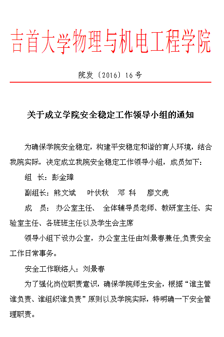 院发[2016]16号--关于成立学院安全稳定工作领导小组的通知