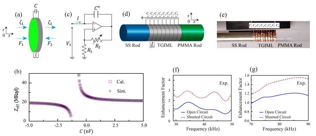 的变化。(c)负电容的实现。(d)和(e)分别为阻抗失配系统插入可调梯度阻抗匹配层后的示意图和实验照片。(f)和(g)分别为两种不同的阻抗失配系统插入可调梯度阻抗匹配层后的声透射增强因子(用无匹配层时的透射做归一化处理)。Open Circuit表示电路断开,此时匹配层的阻抗不可调。Shunted Circuit表示电路连通,此时匹配层的阻抗可用电容调节。