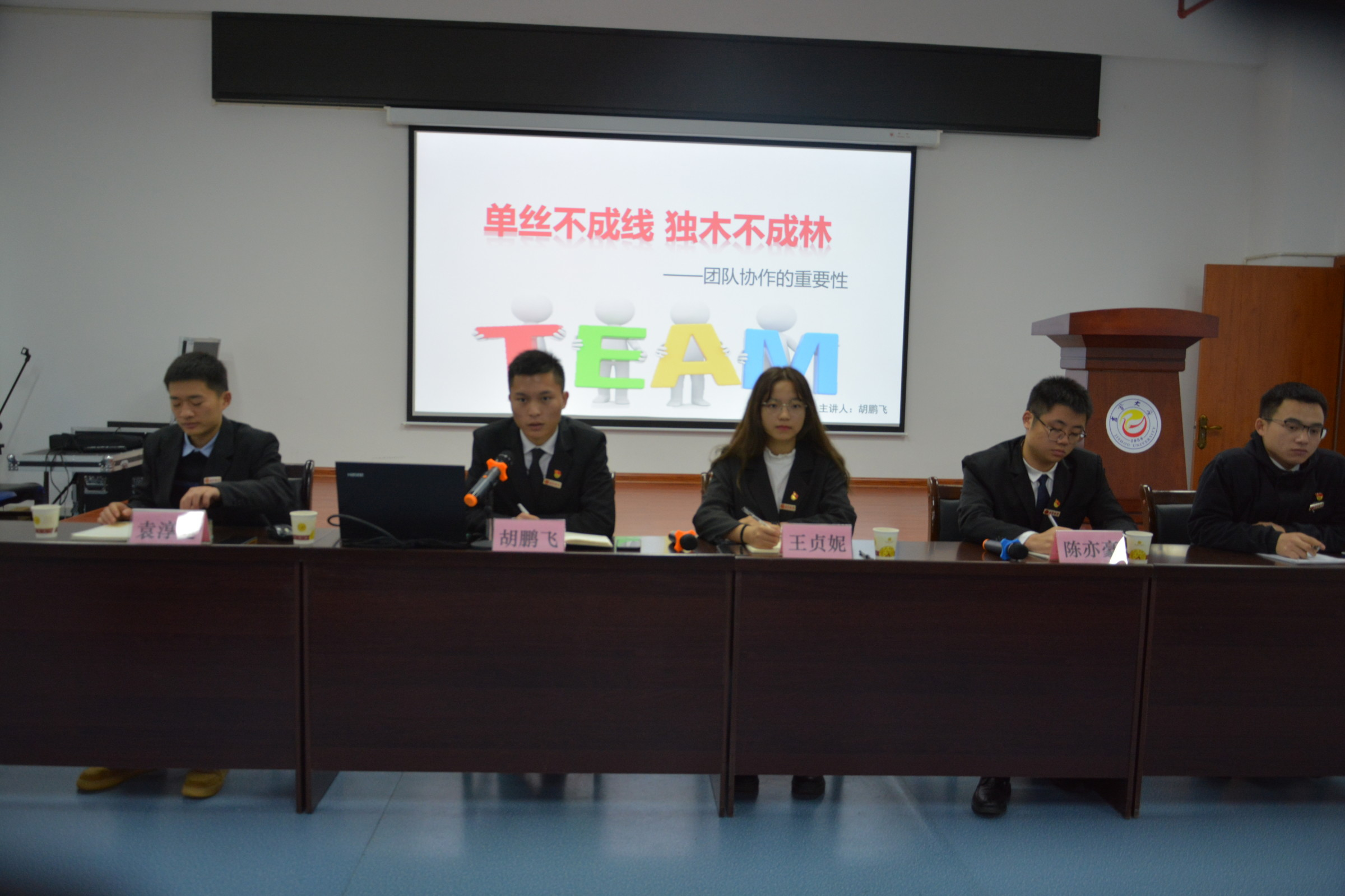 第二节课:单丝不成线,独木不成林——团队协作的重要性。本节课由主席团主持胡鹏飞主席主讲,他首先向我们介绍了什么是团队,并说到团队应该有目的性,有凝聚力。不仅如此,班长,团支书应该起到带领、引导作用,提高班级凝聚力。其次向我们介绍了构成团队的四要素。在上课期间,胡鹏飞主席不断强调团队的重要性。