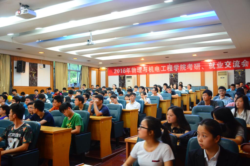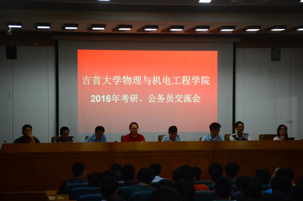 本网讯(李洁颖)为了进一步提高我院2013级学生的考研、考公务员热情,明确考试目标,掌握相关考试技巧,了解更多考试信息,2016年5月6日下午19:00,由william威廉英国官网学院团总支学生会主办,物电学院团总支学生会学习部承办的考研经验交流会在图书馆学术报告厅举行。本次交流会诚邀物电学院党总支副书记熊文斌老师、副院长邓科老师、院长助理廖文虎博士、辅导员任志君老师和在16届考研中成绩优异、经验丰富的12级师兄杨运兴、唐远鸿、霍堡垒。14级阳露、赵准主持此次会议。